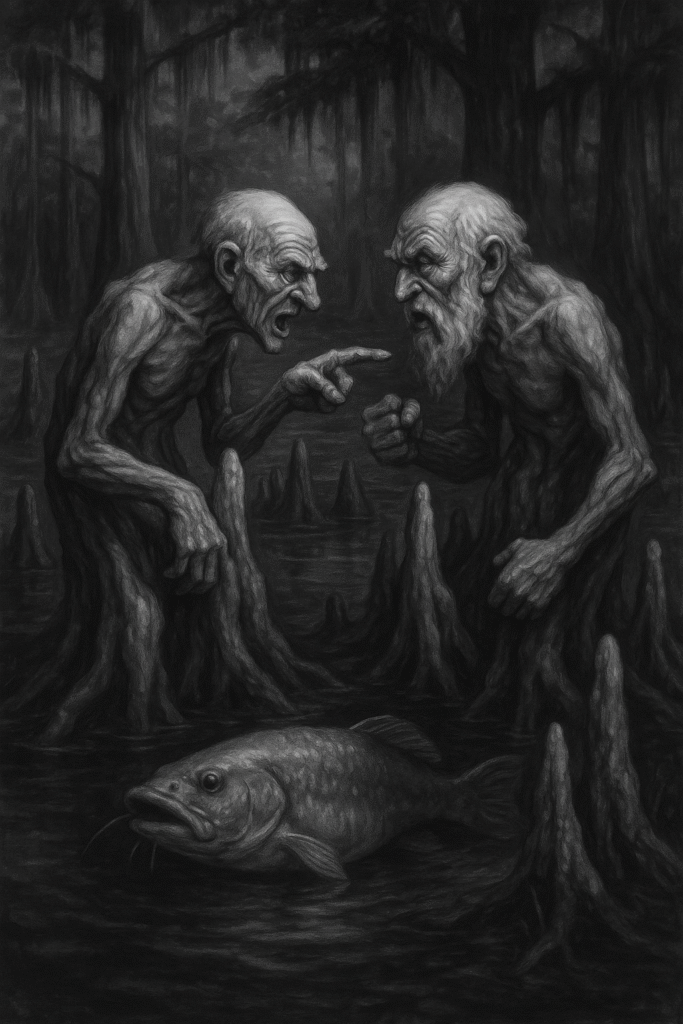 I was sittin’ on a cooler, sketchin’ clouds, when I swear I heard two voices bickerin’ like married catfish. I peeked over and there they were — two cypress knees, shaped like old fellas, yellin’ about fishin’ spots. So I painted what I saw… and that’s why I quit drinkin’ creek water.