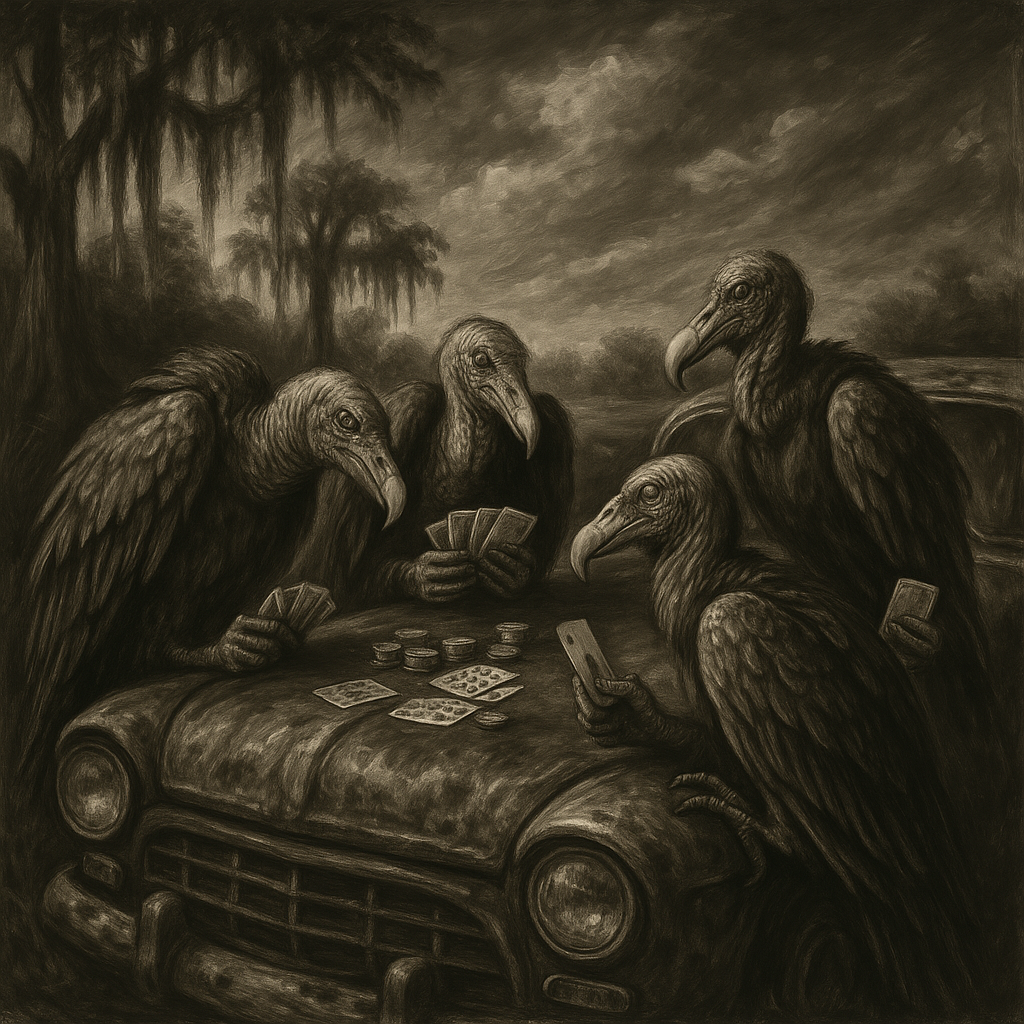 Skunk Ape swears this was a true story — four buzzards caught gambling on the hood of a rusted Ford. He said one was cheatin’, one was smokin’, and one hadn’t blinked in six hands. The fourth? Cold as gator spit.